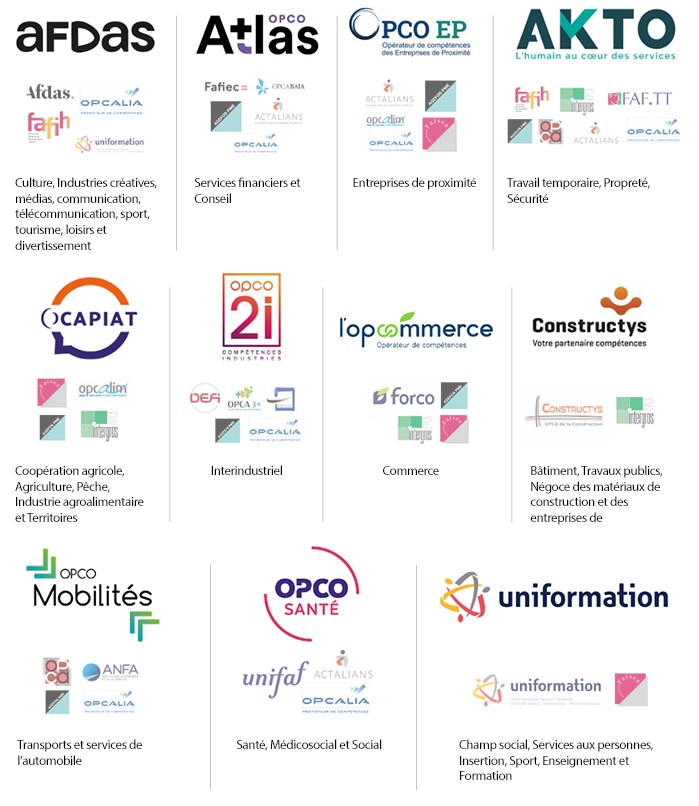 Les Opérateurs de compétences (OPCO) sont des groupements de branches professionnelles suivant des critères métiers, compétences, enjeux de formation et de mobilité. Ils sont compétents pour accompagner les entreprises dans leurs besoins en formation et financer l’apprentissage.